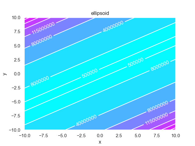 1>>> from pypop7.benchmarks.utils import plot_contour 2>>> from pypop7.benchmarks.rotated_functions import generate_rotation_matrix 3>>> from pypop7.benchmarks.rotated_functions import ellipsoid 4>>> # plot ill-condition and non-separability 5>>> generate_rotation_matrix(ellipsoid, 2, 72) 6>>> contour_levels = [0, 5e5, 8e6, 4e7, 8e7, 1.15e8, 1.42e8, 1.62e8, 1.78e8, 1.85e8, 2e8] 7>>> plot_contour(ellipsoid, [-10.0, 10.0], [-10.0, 10.0], contour_levels)