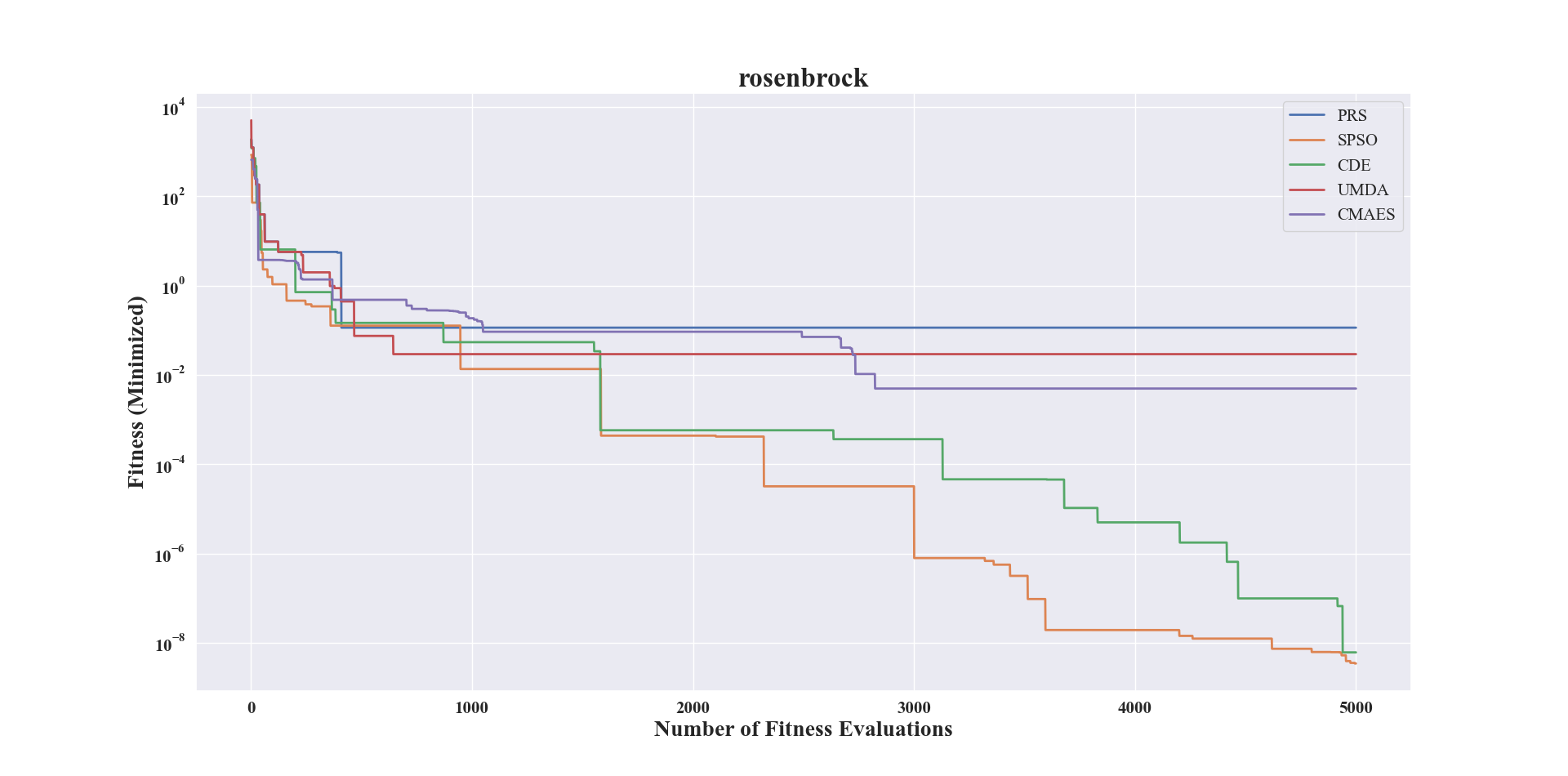 1>>> import numpy # engine for numerical computing 2>>> from pypop7.benchmarks.base_functions import rosenbrock # function to be minimized 3>>> from pypop7.optimizers.rs.prs import PRS 4>>> from pypop7.optimizers.pso.spso import SPSO 5>>> from pypop7.optimizers.de.cde import CDE 6>>> from pypop7.optimizers.eda.umda import UMDA 7>>> from pypop7.optimizers.es.cmaes import CMAES 8>>> from pypop7.benchmarks.utils import plot_convergence_curves 9>>> problem = {'fitness_function': rosenbrock, # to define problem arguments 10>>> 'ndim_problem': 2, 11>>> 'lower_boundary': -5.0*numpy.ones((2,)), 12>>> 'upper_boundary': 5.0*numpy.ones((2,))} 13>>> options = {'max_function_evaluations': 5000, # to set optimizer options 14>>> 'saving_fitness': 1, 15>>> 'sigma': 3.0, 16>>> 'seed_rng': 2022} 17>>> res = [] 18>>> for Optimizer in [PRS, SPSO, CDE, UMDA, CMAES]: 19>>> optimizer = Optimizer(problem, options) # to initialize the black-box optimizer class 20>>> res.append(optimizer.optimize()) # to run the optimization process 21>>> plot_convergence_curves([PRS, SPSO, CDE, UMDA, CMAES], rosenbrock.__name__, 2, results=res)