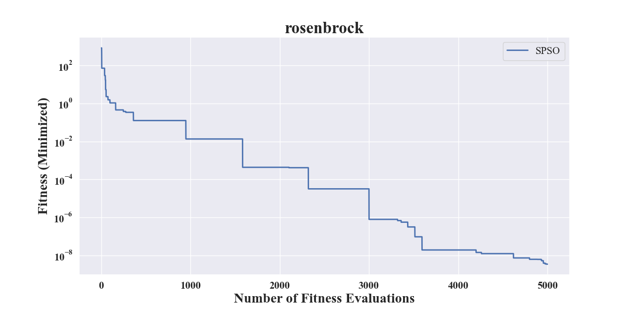 1>>> import numpy # engine for numerical computing 2>>> from pypop7.benchmarks.base_functions import rosenbrock # function to be minimized 3>>> from pypop7.optimizers.pso.spso import SPSO 4>>> from pypop7.benchmarks.utils import plot_convergence_curve 5>>> problem = {'fitness_function': rosenbrock, # to define problem arguments 6... 'ndim_problem': 2, 7... 'lower_boundary': -5.0*numpy.ones((2,)), 8... 'upper_boundary': 5.0*numpy.ones((2,))} 9>>> options = {'max_function_evaluations': 5000, # to set optimizer options 10... 'saving_fitness': 1, 11... 'seed_rng': 2022} 12>>> spso = SPSO(problem, options) # to initialize the black-box optimizer class 13>>> res = spso.optimize() # to run the optimization process 14>>> plot_convergence_curve('SPSO', rosenbrock.__name__, 2, results=res)