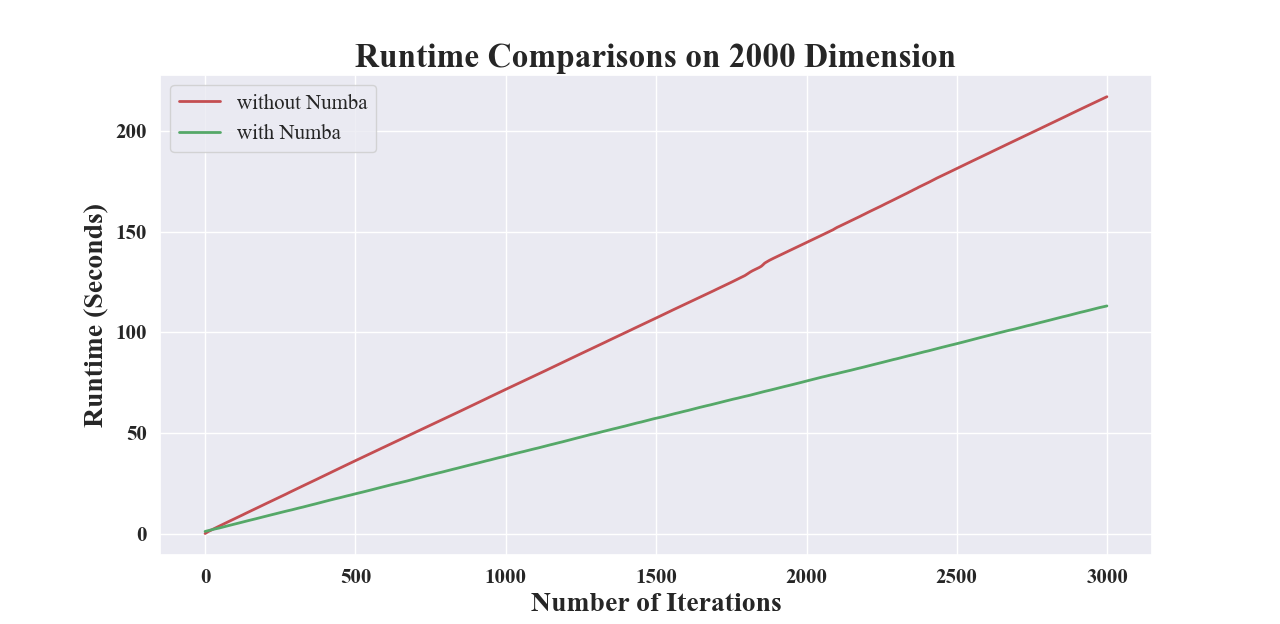 例如,对于秩一更新,使用与不使用 Numba 的运行时间比较如下所示